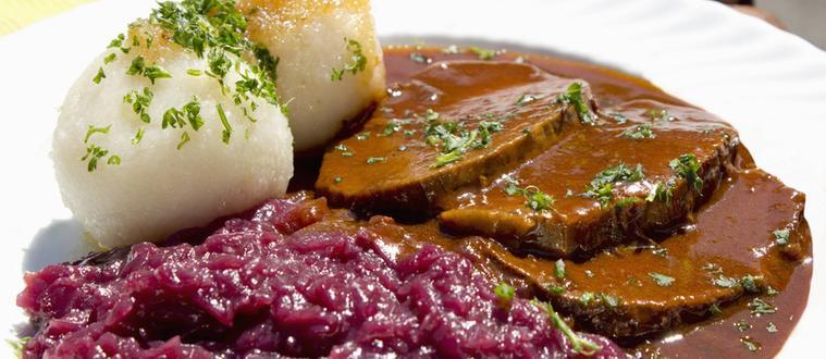 독일의 전통 고기요리 자우어브라텐은 부드러운 식초와 다양한 향신료에 절인 부드러운 쇠고기의 깊고 풍성한 맛을 느낄 수 있는 스튜입니다. 이 맛있는 스튜는 전통적으로 붉은 양배추와 만두처럼 보이는 카토펠클뢰쎄(kartoffelklöße) 또는 삶은 감자와 함께 먹습니다. 보통 며칠에 걸쳐 와인과 식초를 섞어 쇠고기, 말고기 또는 사슴 고기를 담가 넣어 며칠을 숙성시킵니다. 독일의 국가 요리 중 하나로 선정 된 이 sauerbraten은 독일 전통요리 레스토랑에서 빠지지 않는 메뉴입니다. 꼭 드셔보세요.