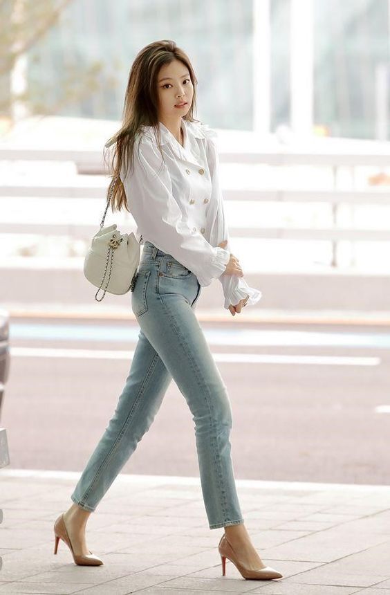 제니는 청바지도 참 예쁘게 잘어울리는데요. 화이트 블라우스와 피부톤에 녹아드는 베이지 펌프스 힐로 매치한 코디가 너무 여성스럽고 예쁩니다. 화이트 블라우스에 피부톤에 어울리는 브라운컬러 헤어가 룩을 완성한 것 같습니다. 왠지 모르게 가을뮤트톤 분들은 단정한 머리스타일 보다는 조금 부스스하고 자연스러운 컬의 머리가 잘 어울리는 것 같습니다.