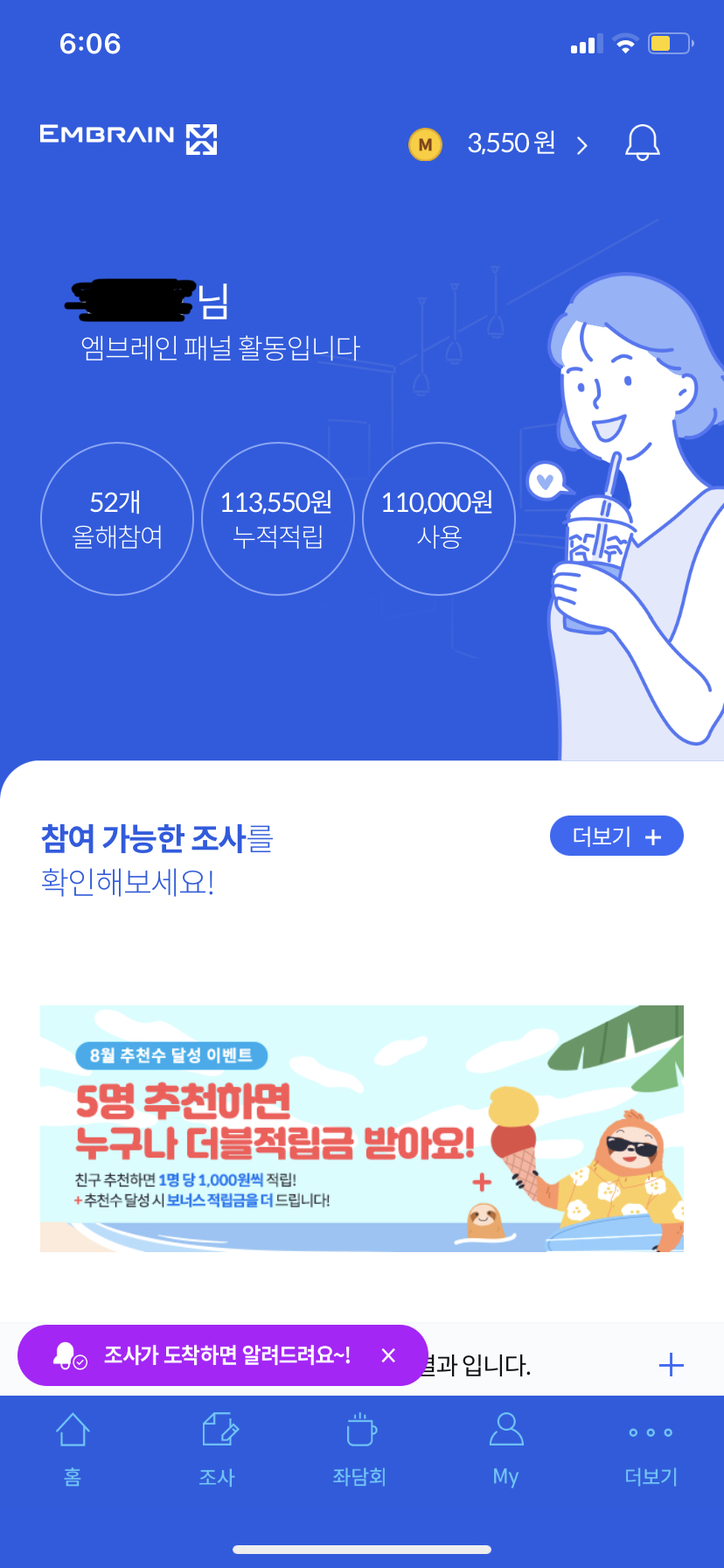 엠브레인이라는 조사회사에서 운영하는 서베이앱인데요. 여기도 현금으로 입금해줘서 쏠쏠해요!