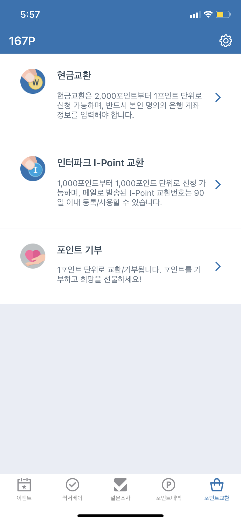 다른 것보다 현금교환이 진짜 매력적인 것 같아요. 2000포인트가 쌓이면 은행계좌로 현금 입금을 신청할 수 있어요!