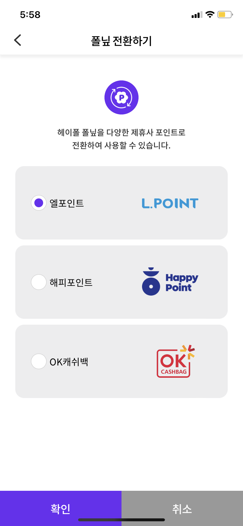 포인트는 폴닢이라고 하는데 이걸 이렇게 해피포인트, 롯데L포인트, ok캐쉬백으로 전환할 수 있어요.