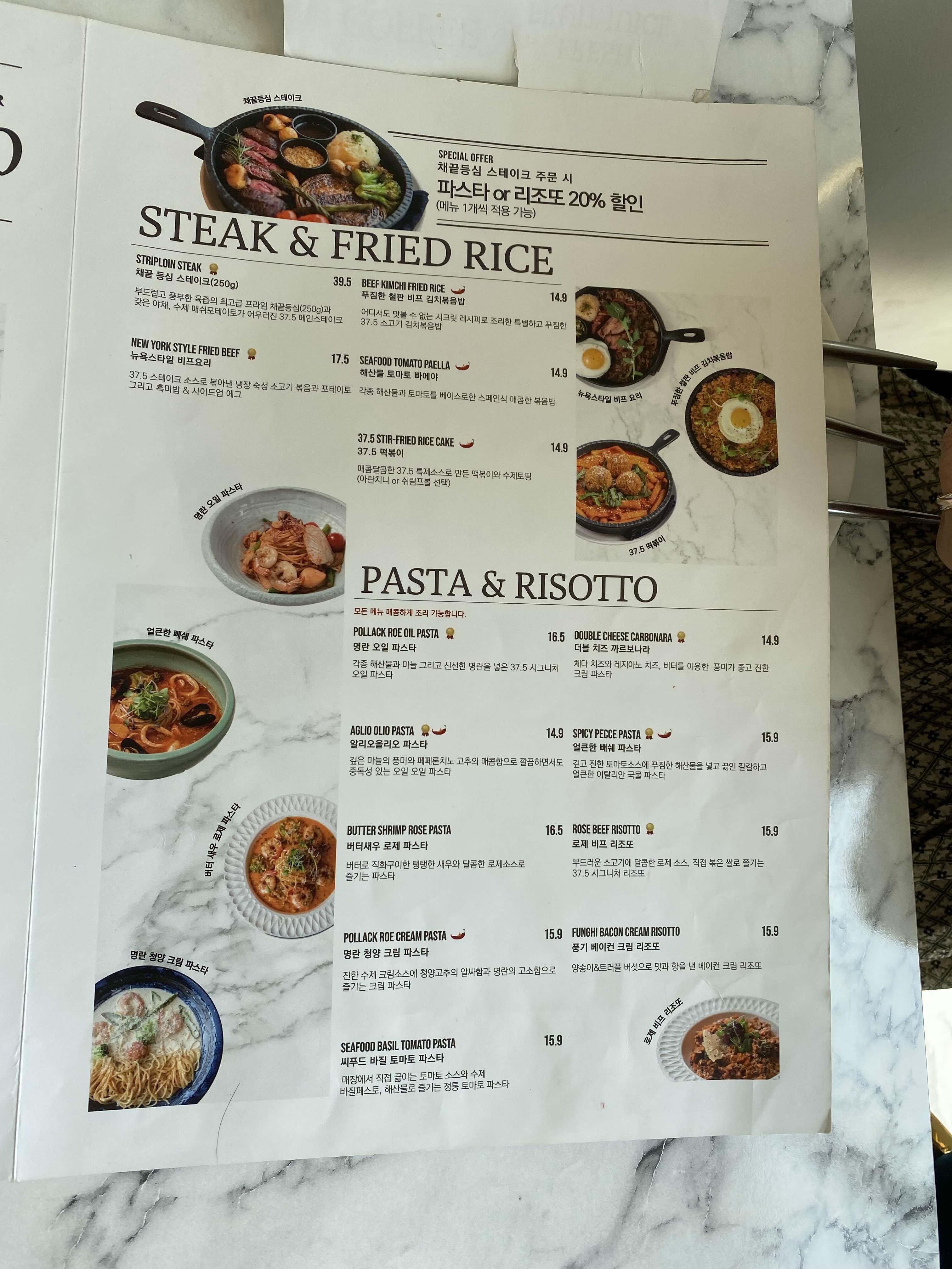 식사용으로 스테이크, 파스타, 빠에야, 김치볶음밥, 떡볶이도 있고, 파스타는 정말 종류가 다양하네요.