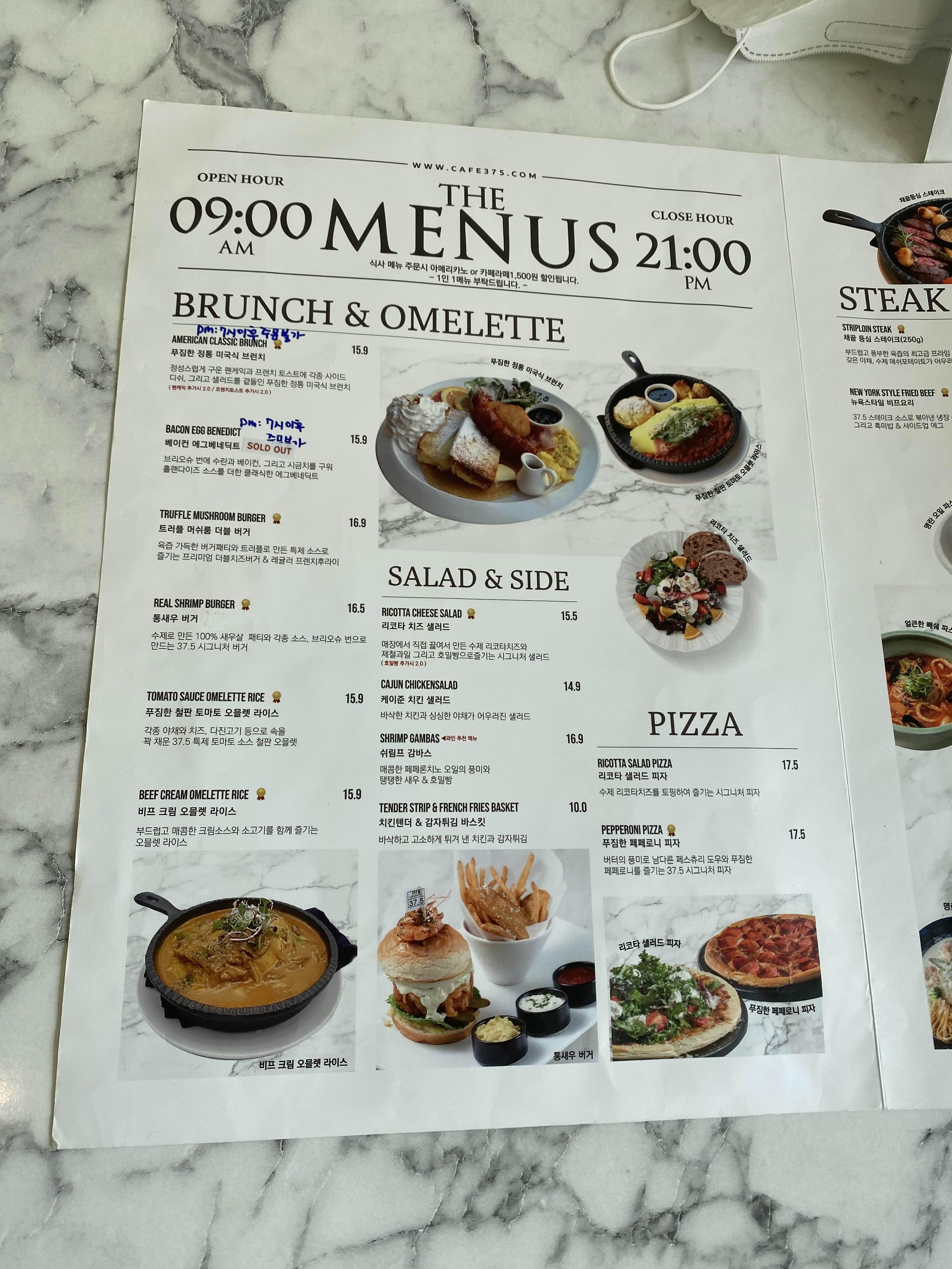 브런치 메뉴는 미국식 브런치 메뉴들이 많고, 햄버거, 오믈렛, 샐러드, 피자 등등 있네요.