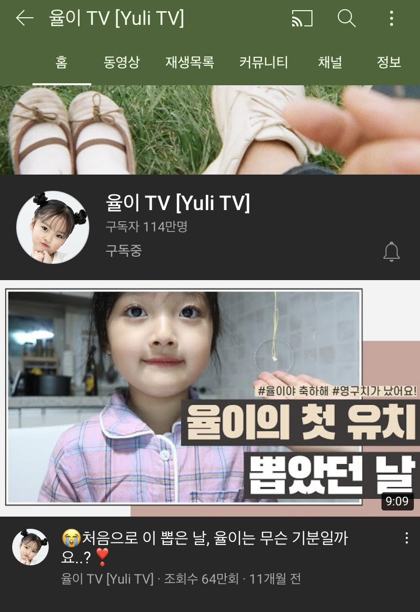 엄마와 예쁜 딸 율이가 출연하는 율이 TV입니다. 인스타에서 너무나도 유명한 아기 율이가 많이 커서 구독자분들께 어잇! 하고 인사도 하고 촬영도 합니다. 전에는 율이가 마냥 귀여워서 영상을 구경했는데, 이제는 제가 엄마가 될 나이여서 그런지 율이 엄마의 마음도 들여다 보게 되고, 율이 엄마를 통해서 저희 엄마도 생각나고 그러네요. 역시 가족의 모습에서 오는 힐링은 소소한 일상들인 것 같아요. 모녀밥상이라는 시리즈를 통해서도 그냥 소소하게 집밥해먹는 영상인데 힐링 받곤 한답니다. 또 두 사람이 서로를 위해 부른 노래를 듣다가 울컥하기도 했답니다. 모녀간의 따뜻한 정을 보며 힐링하는 유튜브 채널입니다.
