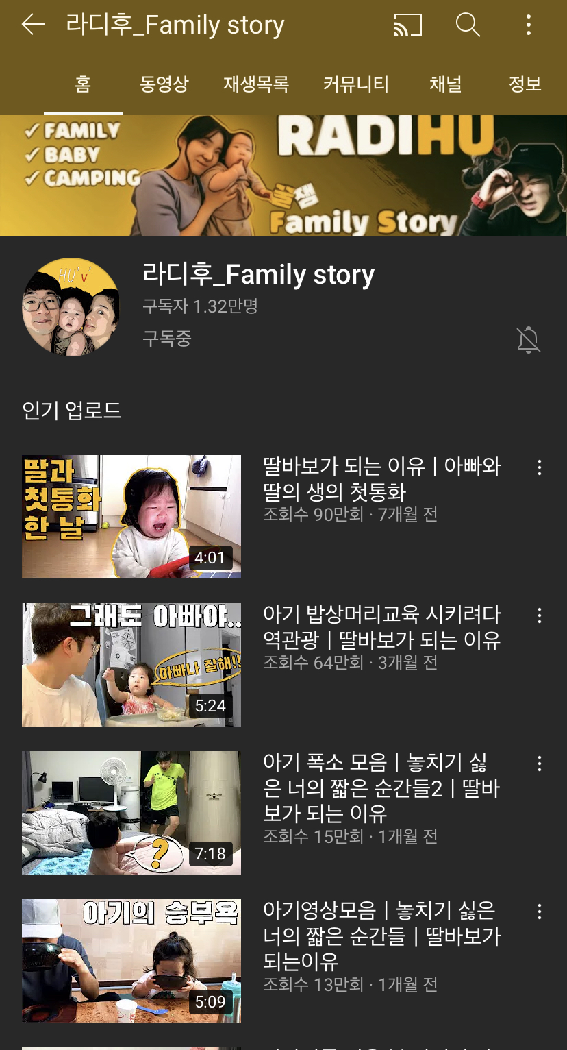 최근에 알게 된 유튜브 채널인데요. 아기 아빠가 운영하는 유튜브 채널입니다. 출산기부터 현재 말문이 트인 아기때까지 있는 다양한 이야기들을 에피소드 형식으로 풀어내는 재밌는 유튜브 채널입니다. 아기는 세상 모든 일이 처음이다보니 그 리액션이 재밌고 그걸 그렇게 받아주는 아빠가 재밌습니다. 신혼부부 혹은 어린 아기가 있는 젊은 부부의 모습이 이렇겠죠? 비슷한 시기를 살며 소소한 가족의 모습을 보여주어서 보면서 힐링하는 채널입니다.