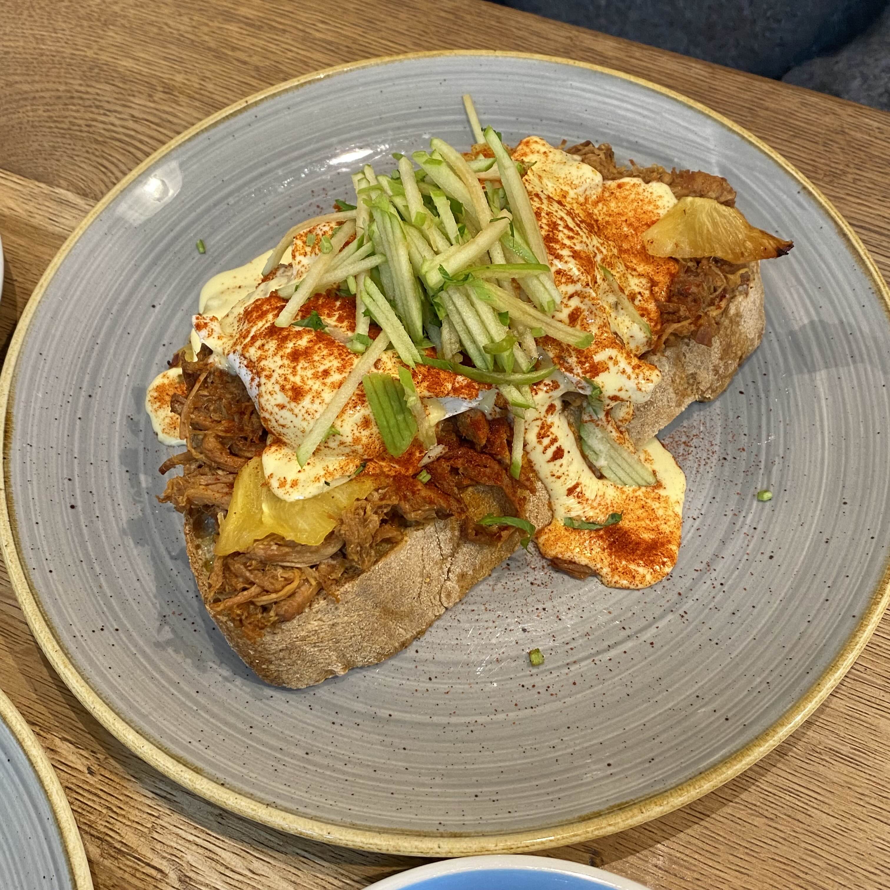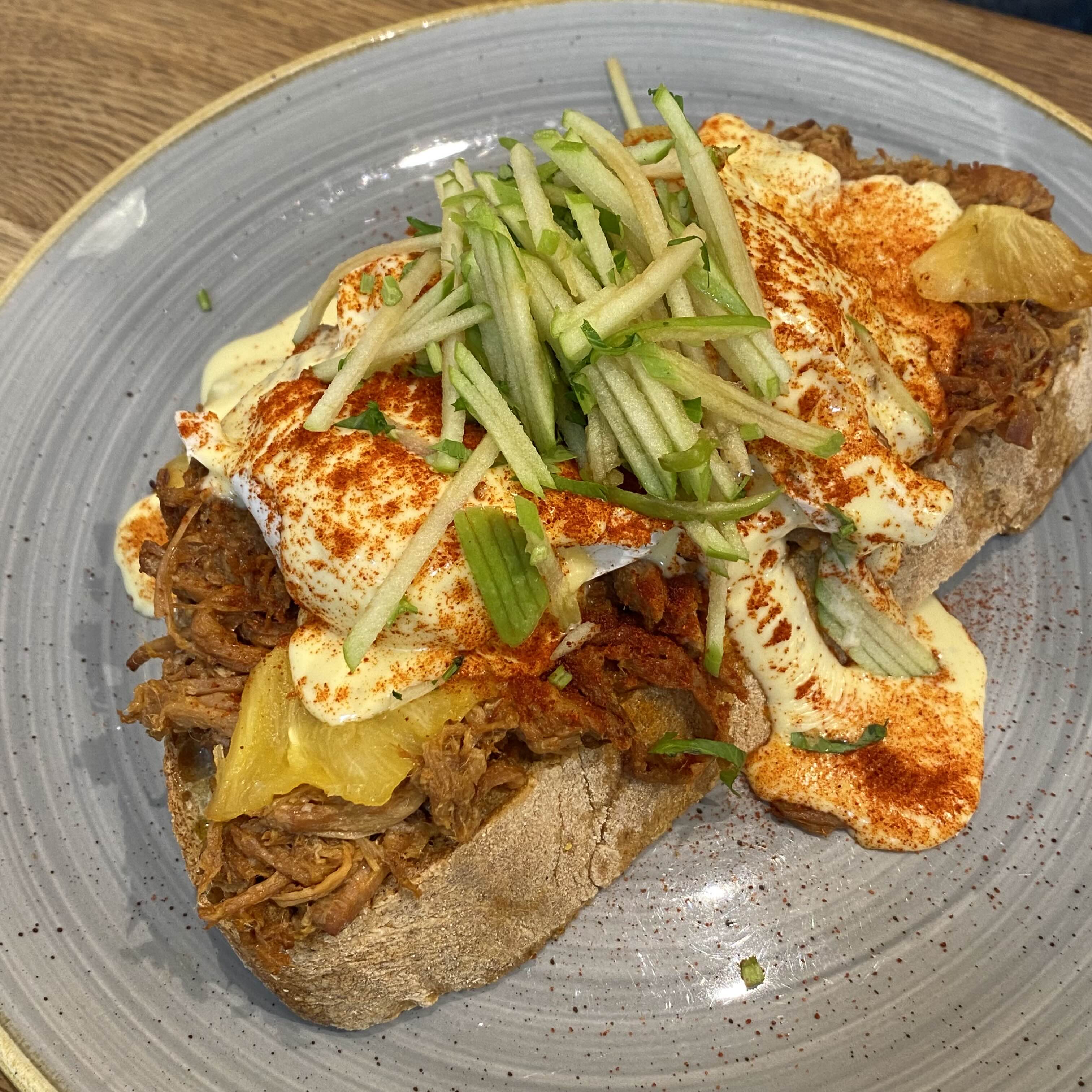 FC Benedict - Pulled Pork, Chipotle, Poached Eggs, Hollandaise, Apple, Coriander, Sourdough Toast 16