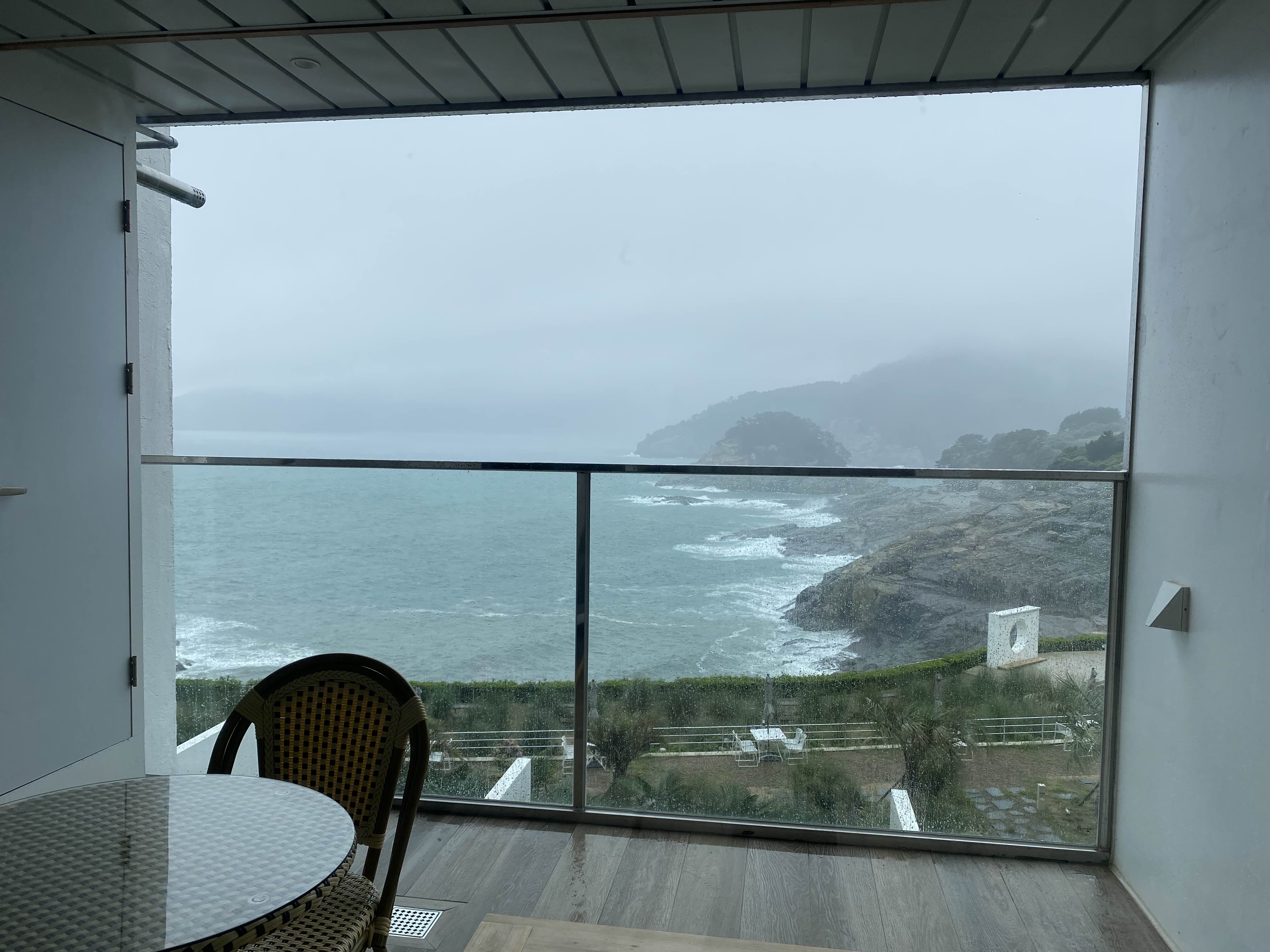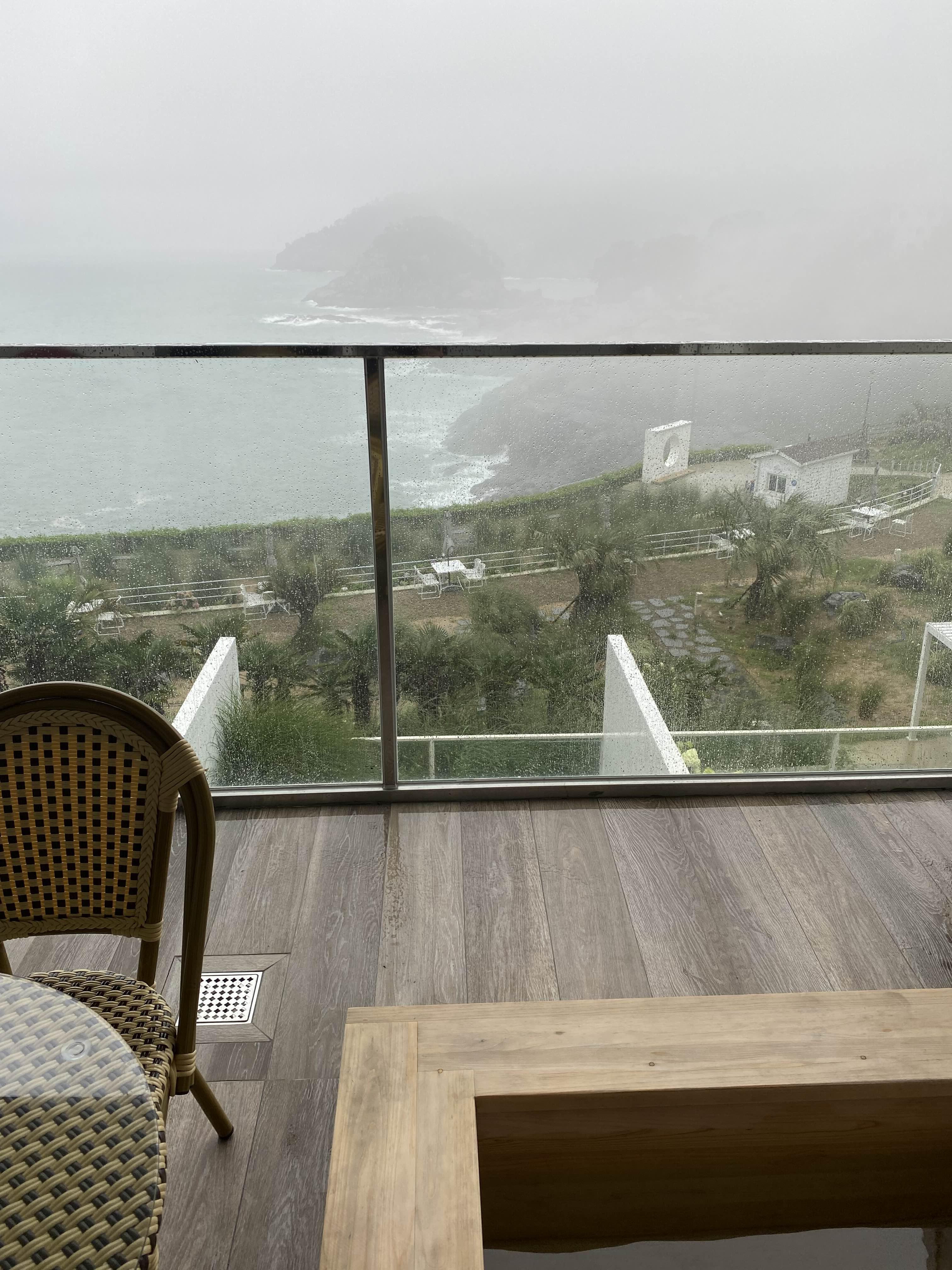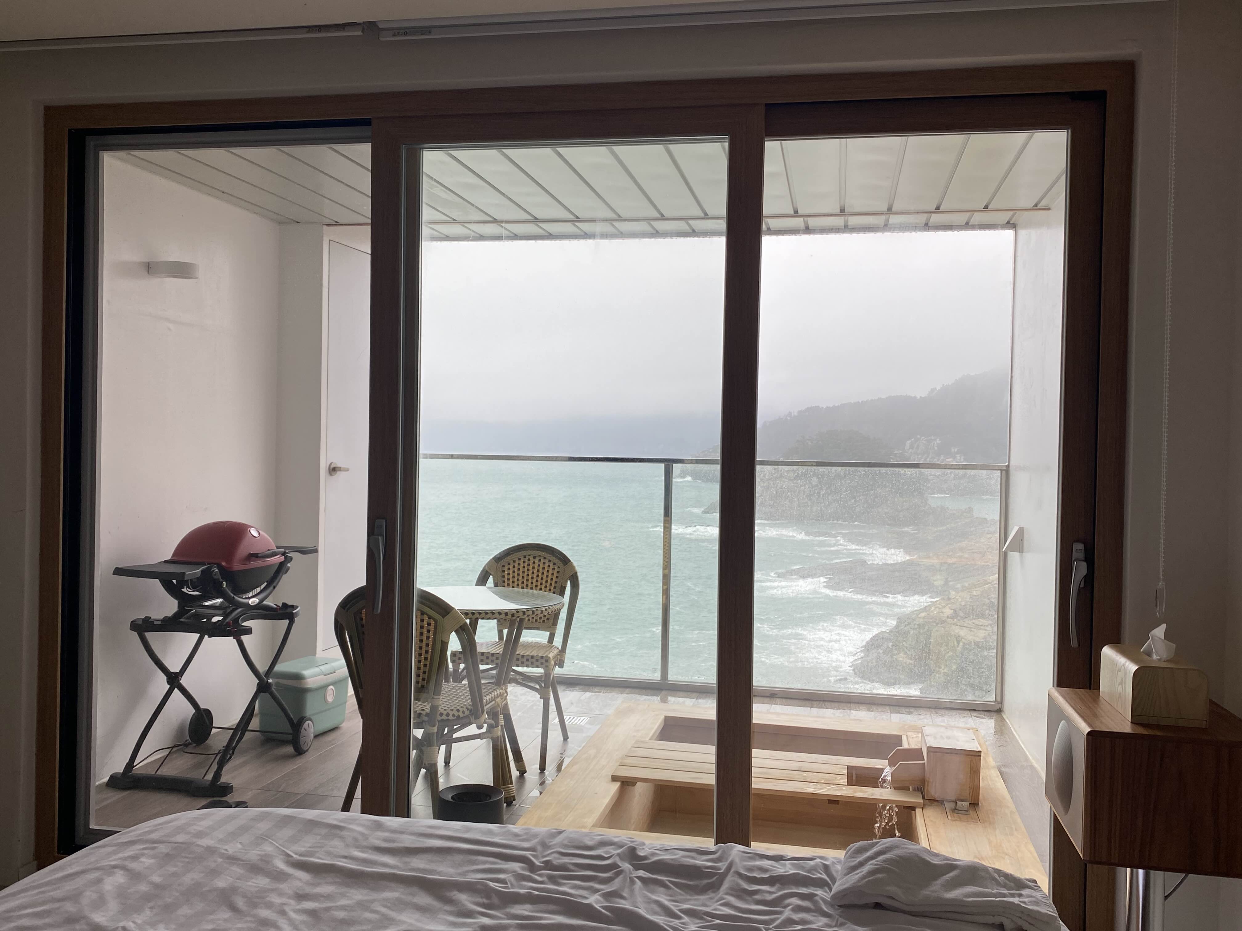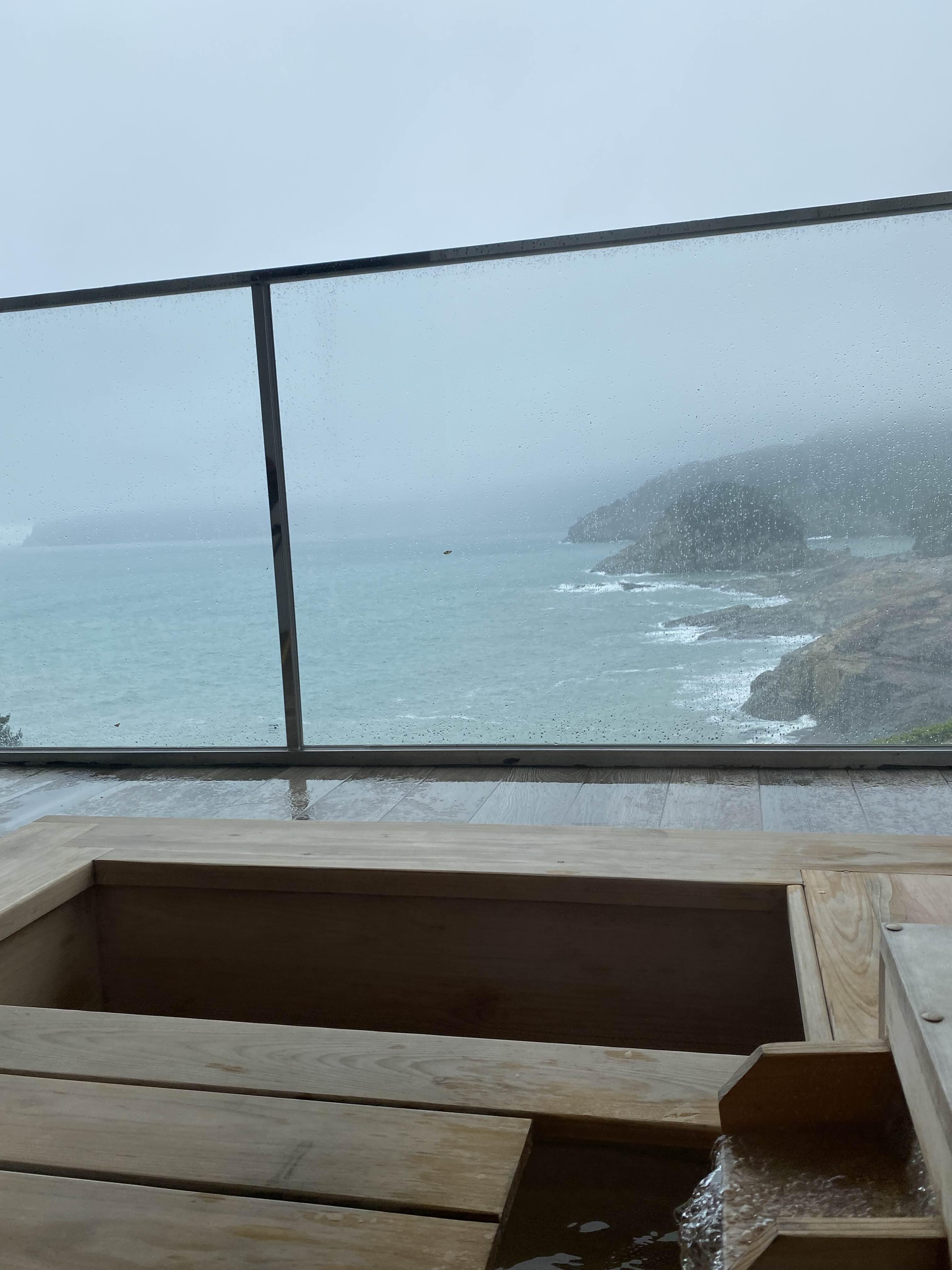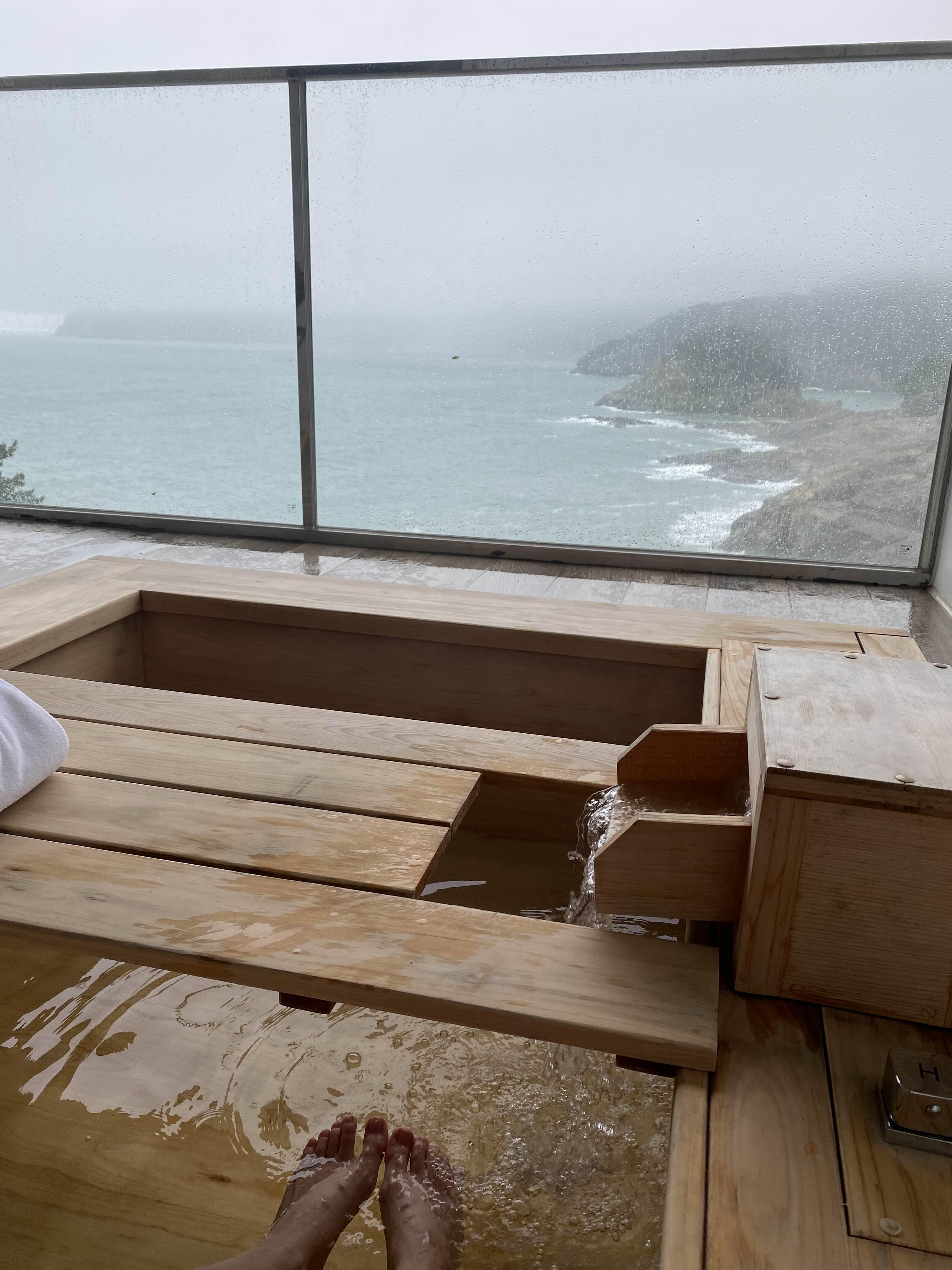 숙소에서 히노키탕으로 피로를 풀며 비내리는 바다를 구경할 수 있었고