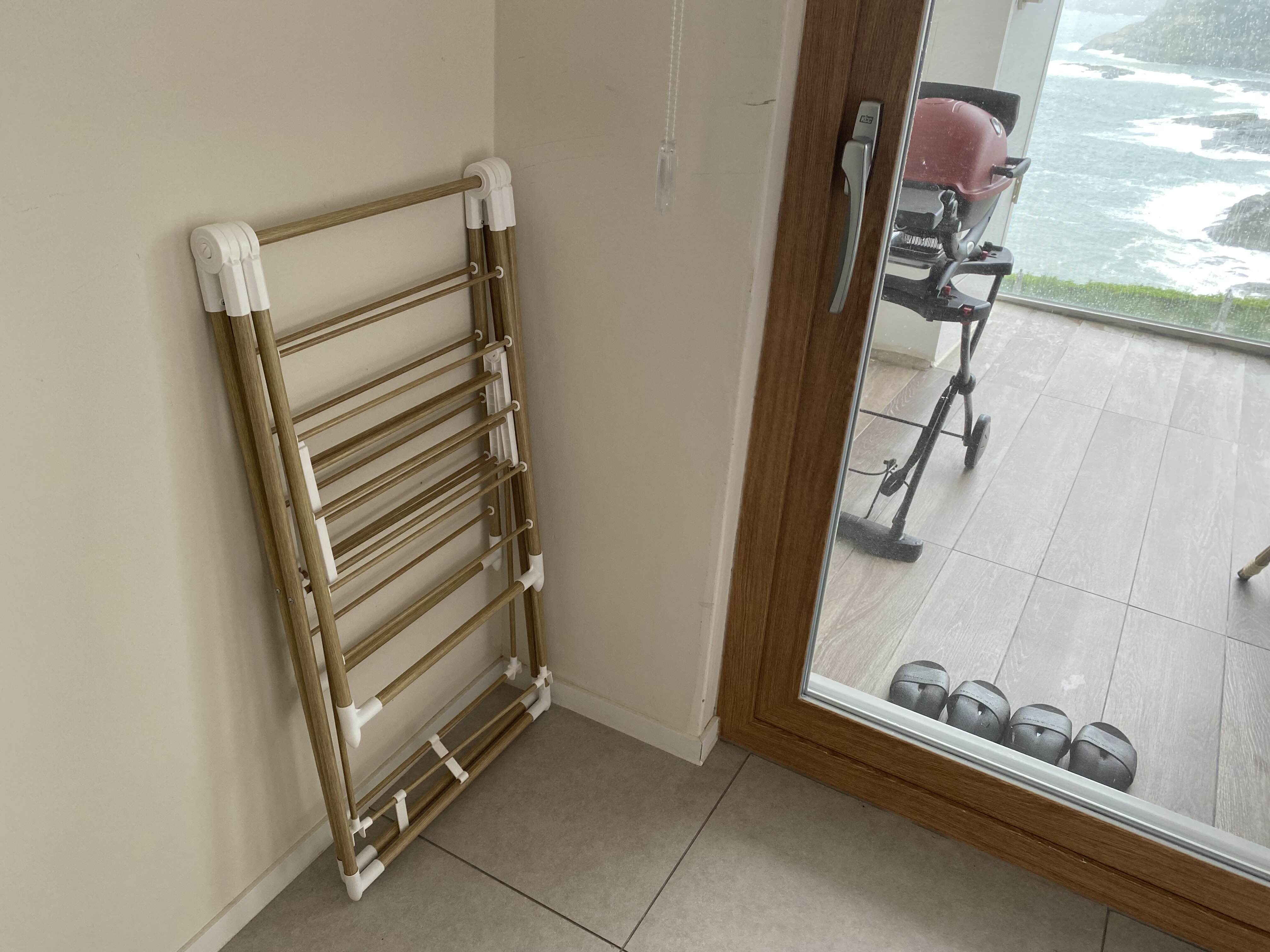 저 콘솔 가구에 히노키탕 이용할 때 입을 수 있는 찜질방복같은거 있는데, 잘못말랐는데 빨래쉰내가 좀 나서 저희는 이용안했지만 따로 수영복이나 없으면 입기 좋을 것 같고, 젖은 옷 말릴 수 있게 빨래건조대도 있어서 편해요.