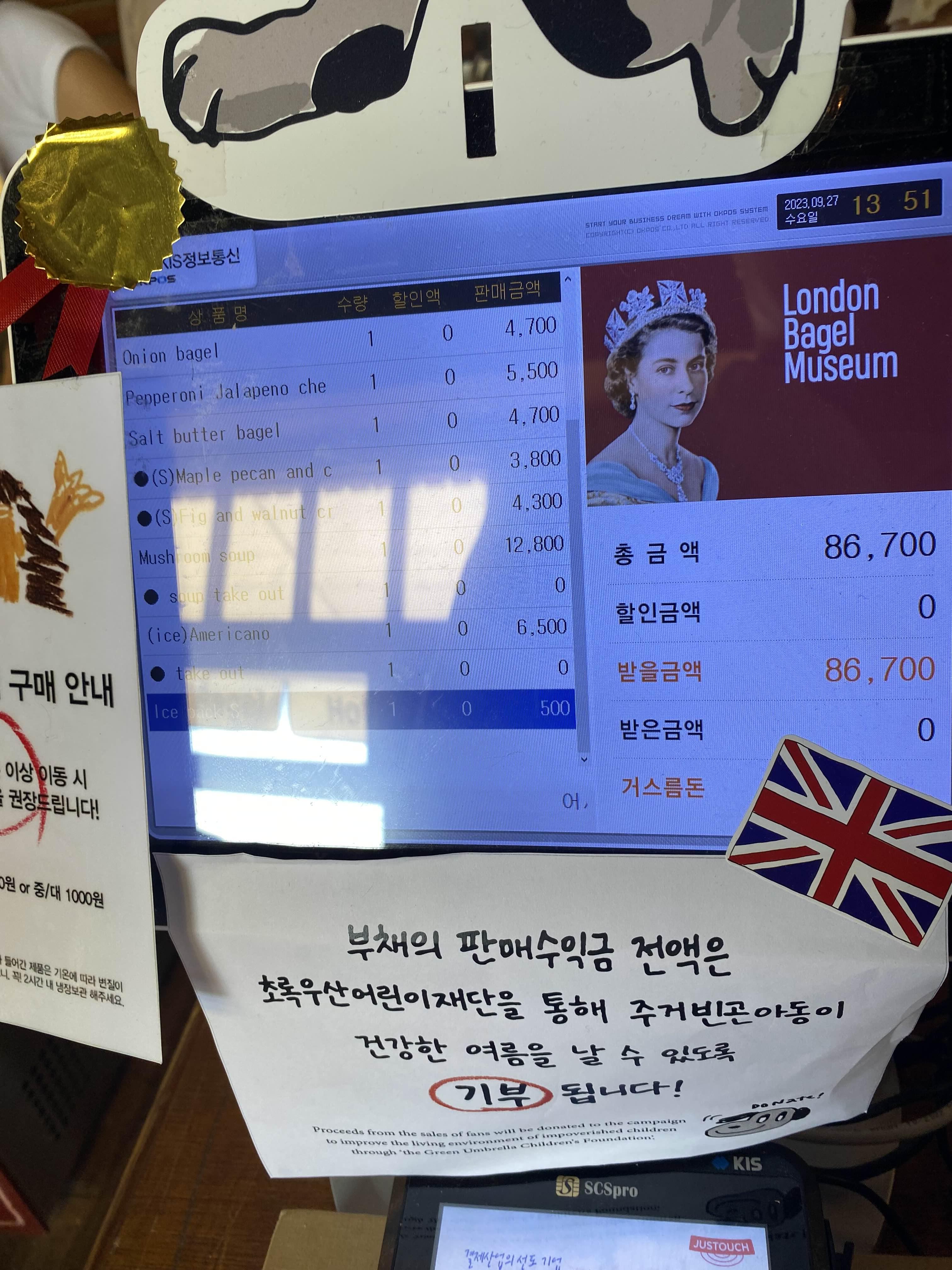 베이글 7개랑 크림치즈발라진 베이글 2개, 크림치즈 2개, 아아 1개, 트러플머쉬룸스프 1개 했는데.. 가격이...ㄷㄷ