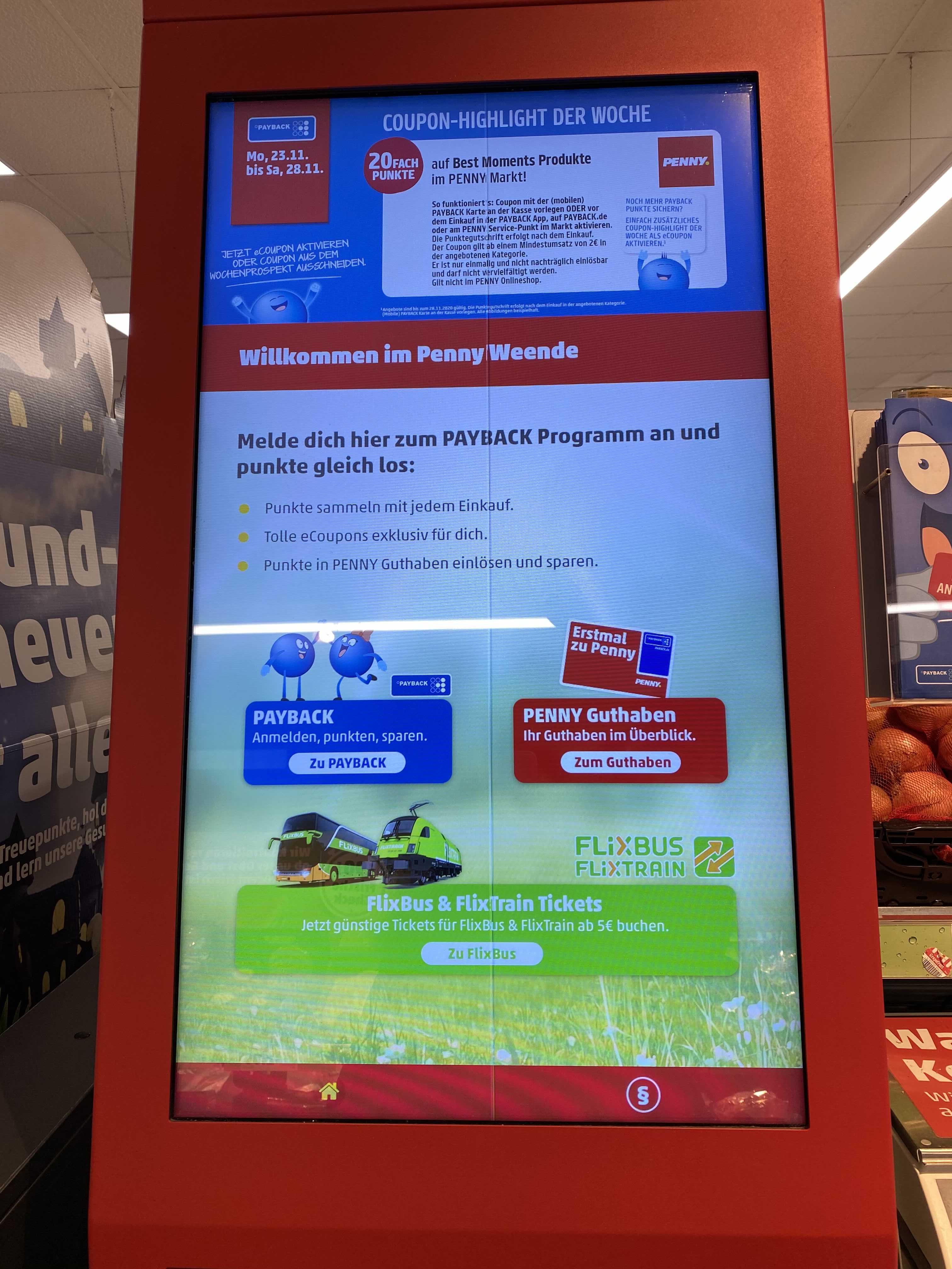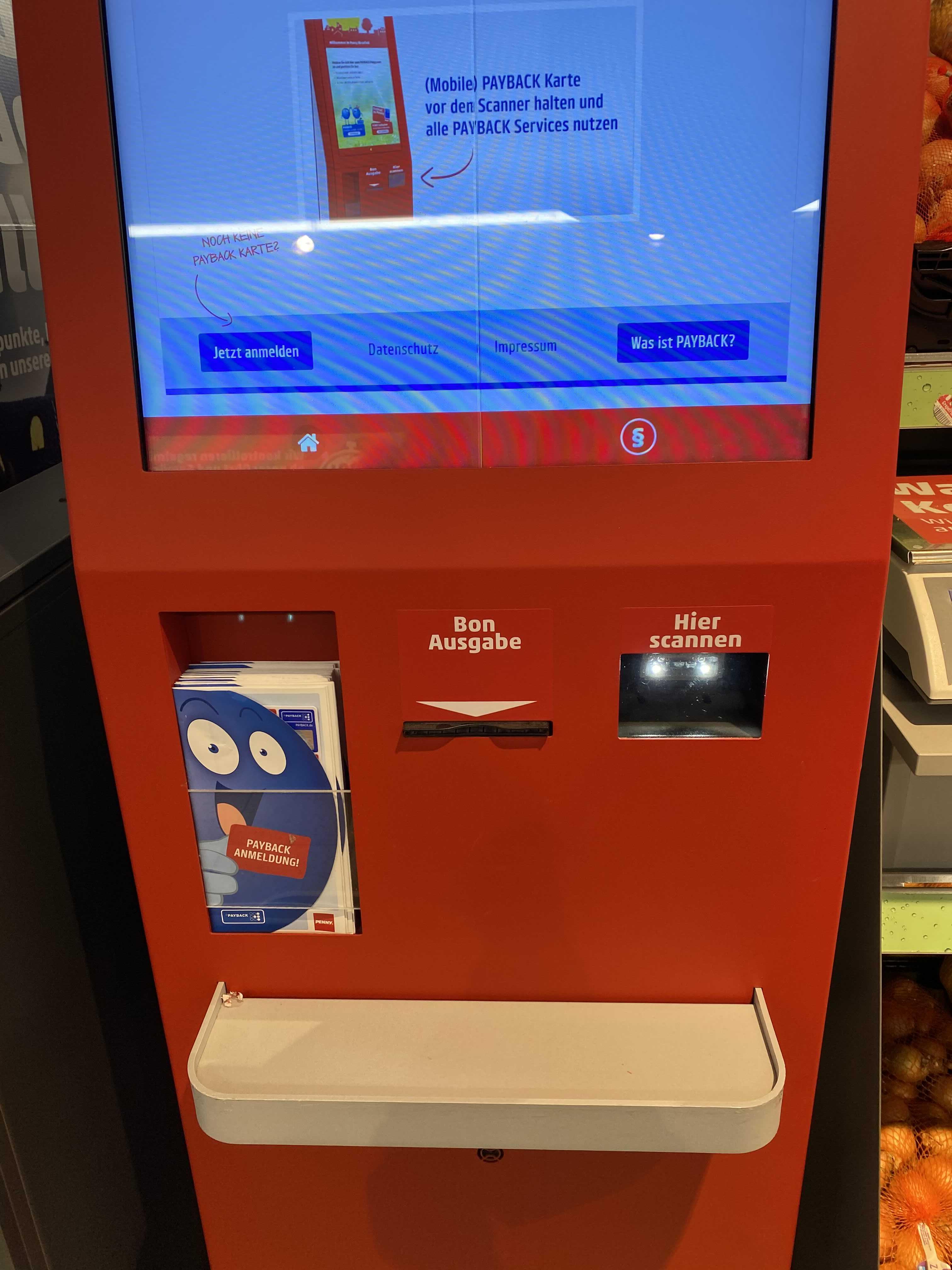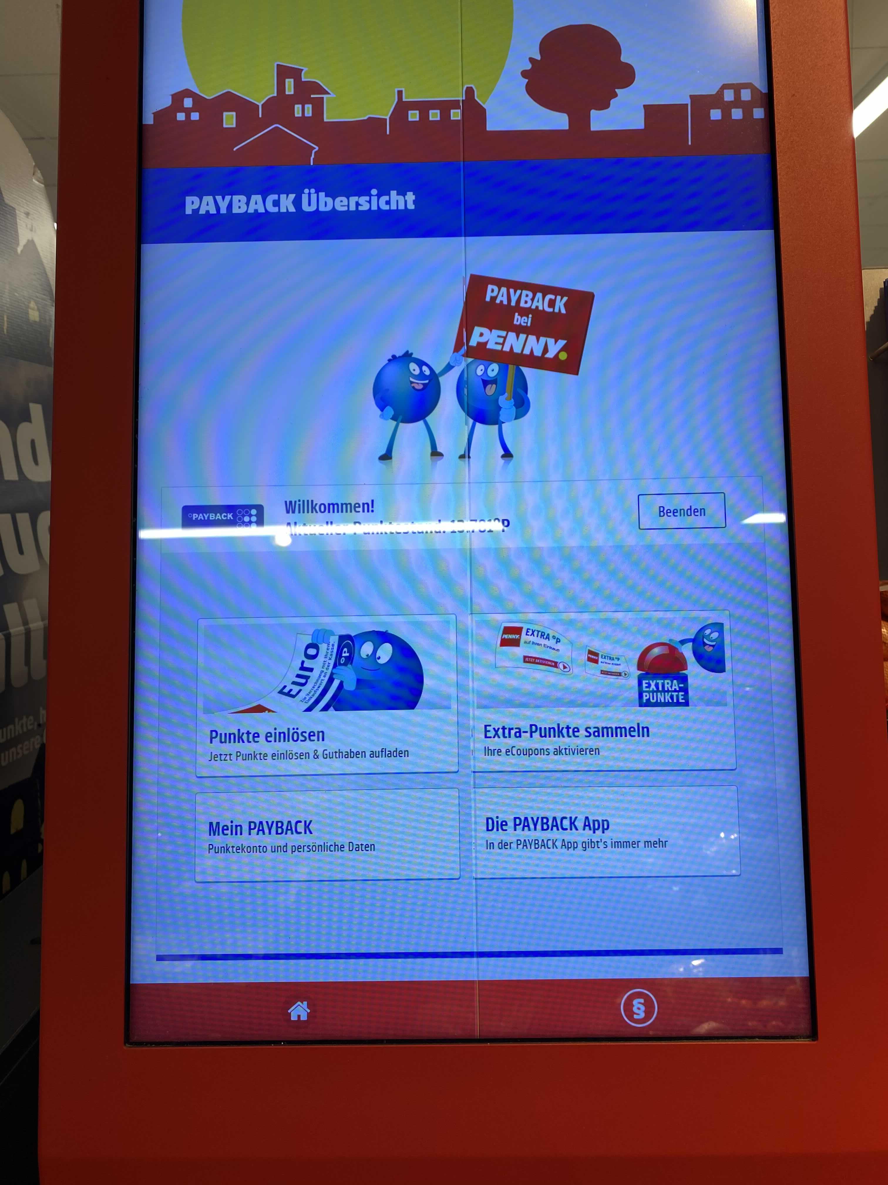 페이백을 취급하는 마트나 매장에는 이런 빨간 기계가 설치되어 있습니다. 여기 화면을 터치해서 포인트 사용해볼게요.