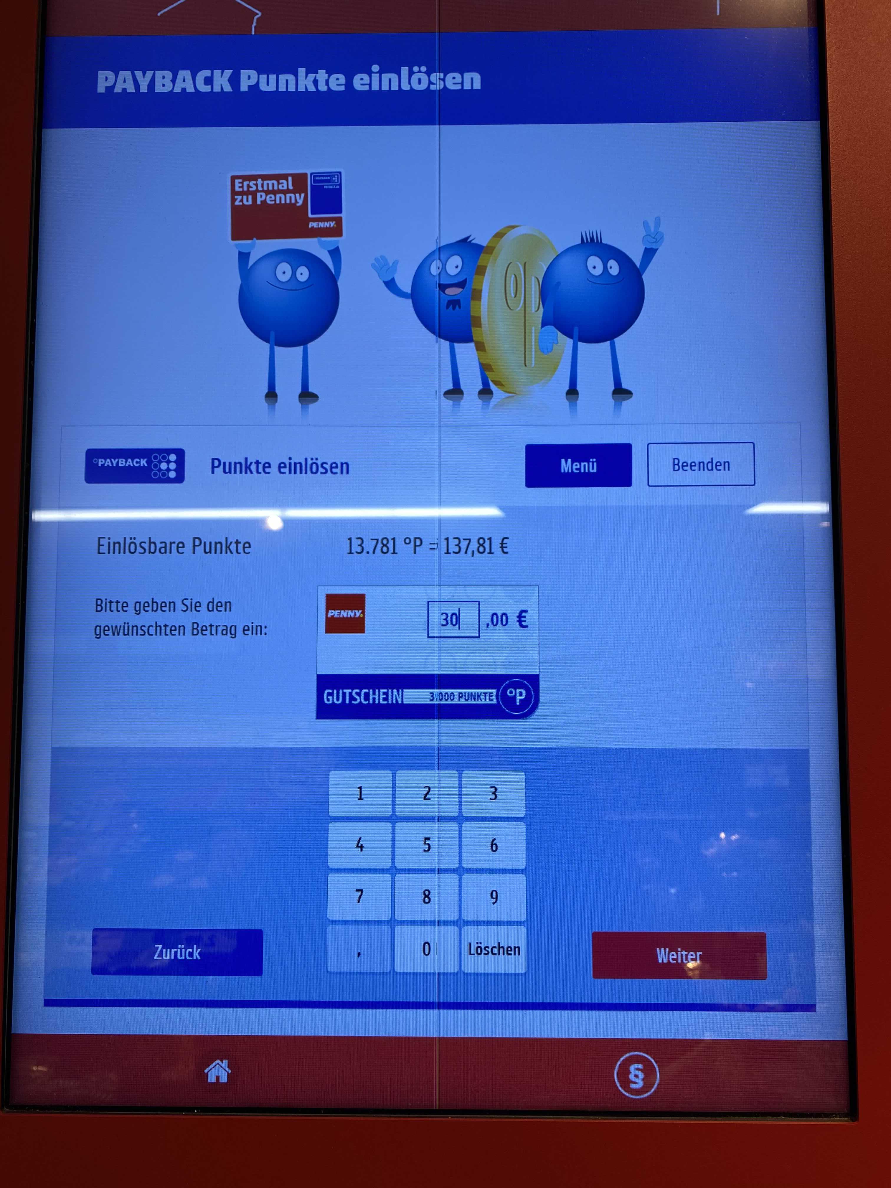 7. 저는 anderer Betrag를 선택하여 3000포인트 차감을 입력했습니다. 그리고 weiter를 터치합니다.